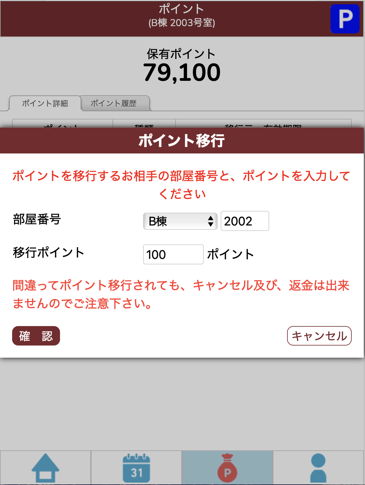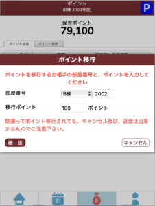 ポイント移行をタップして、「送りたい住戸・送りたいポイントを入力」